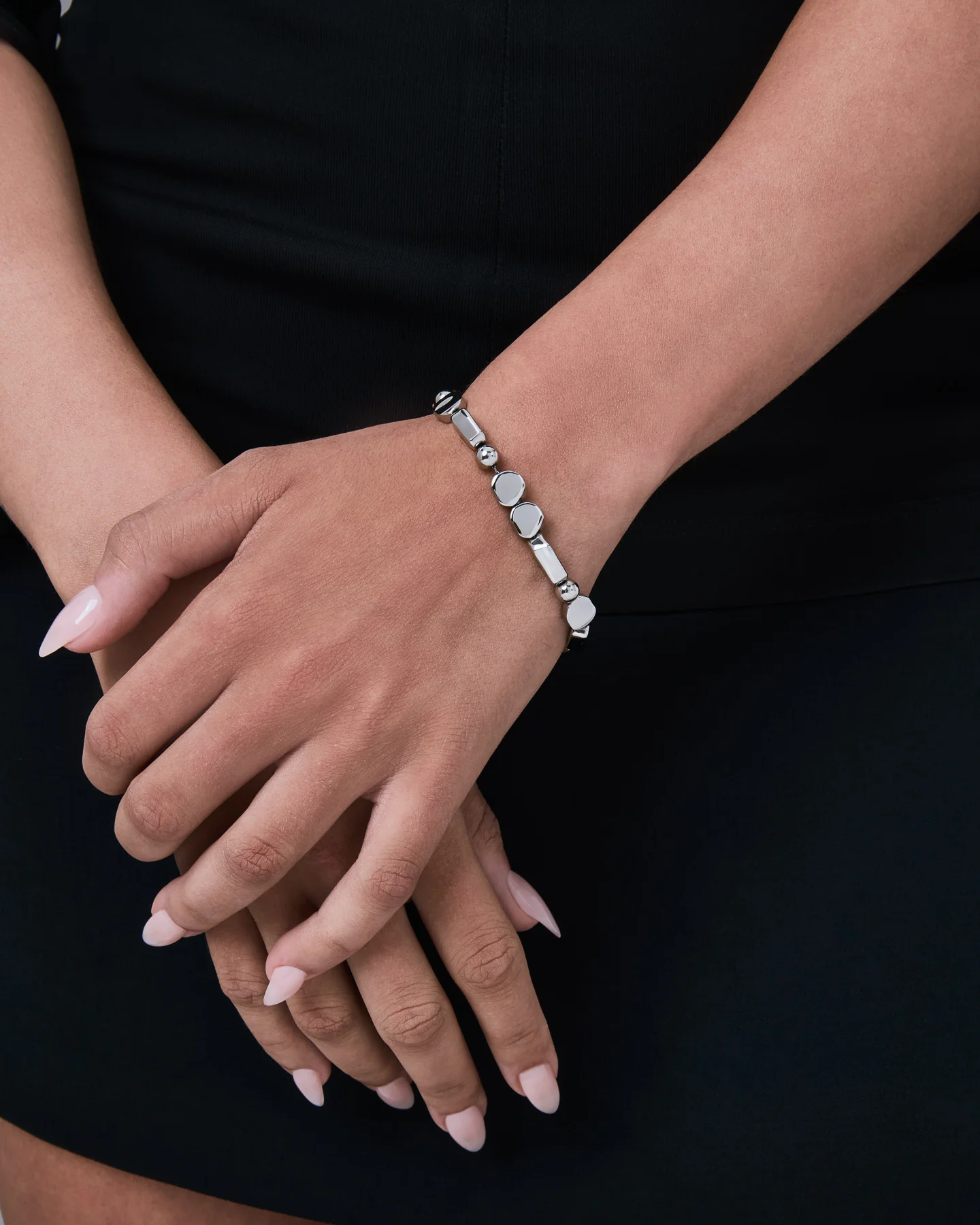 Built from a sequence of irregular, polished segments to form an articulated profile that emphasizes asymmetry and repetition. Each element is interspersed with spherical connectors, creating a continuous, layered rhythm along the wrist. An extended chain segment anchors the construction, and a reinforced clasp provides secure fastening.